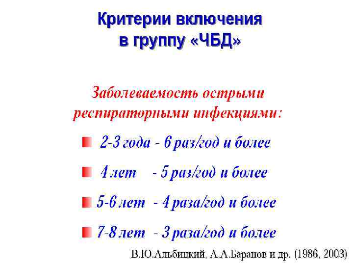 БЕНДЖАМИН СПОК О ПРОБЛЕМЕ ЧБД (1970) “В возрасте от 2 до 6 лет дети простуживаются чаще, болеют дольше и с осложнениями (в среднем 7 раз в год в северных городах США или даже больше, если в семье есть дети, посещающие детский сад или школу). В 9 лет ребёнок болеет в 2 раза меньше, чем в 6 лет, а в 12 лет – в 2 раза меньше, чем в 9 лет. Эти цифры должны успокоить родителей, которым кажется, что их малыш постоянно болеет”