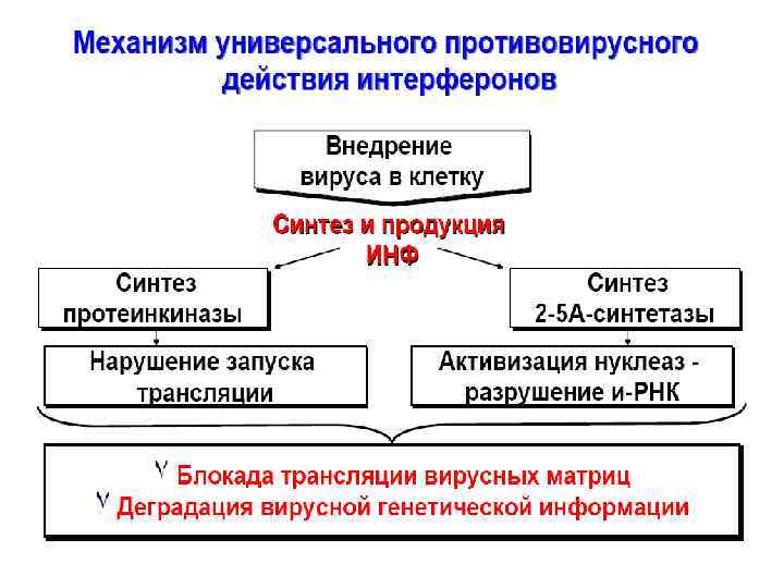 МЕХАНИЗМЫ ПРОТИВОВИРУСНОГО ДЕЙСТВИЯ ИФН Активация синтеза клеточных белков, обладающих противовирусной активностью (протеинкиназы – блокирует синтез ранних вирусных белков, олигоаденилат-синтетазы – индуцирует разрушение вирусной РНК) v Защита неинфицированных клеток v Увеличение литического потенциала NКклеток