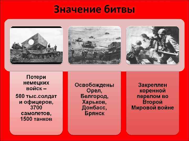 Итоги Курской битвы 1. Был сорван план гитлеровского командования окружить и уничтожить более чем миллионную группировку советских войск. 2. Советскими войсками было разгромлено 30 дивизий, вермахт потерял ок. 500 тыс. солдат и офицеров, 1, 5 тыс. танков. 3 тыс. орудий и более 3, 7 тыс. самолетов. 3. Свыше 100 тыс. советских солдат, офицеров и генералов были награждены орденами и медалями, а 180 самых мужественных удостоены звания «Героя Советского Союза» .