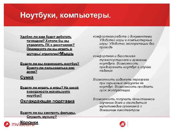 Ноутбуки, компьютеры. Удобно ли вам будет работать тачпадом? Хотели бы вы управлять ПК с расстояния? Планируете ли вы играть в шутеры/ стратегии? Мышь Будете ли вы переносить ноутбук? Будете ли пользоваться вне дома? Сумка Будете ли играть в игры? На какой поверхности используете ноутбук? Охлаждающая подставка Будете ли вы смотреть фильмы, Слушать музыку? Колонки комфортная работа с документами. Удобство игры в компьютерные игры. Удобство эксплуатации без провода комфортная и безопасная транспортировка и хранение ноутбука. Возможность предохранить ноутбук в случае падения Возможность избежать перегрева при серьезных нагрузках на ноутбук. Возможность продлить срок эксплуатации. Возможность получить качественное звучание дома и насладиться мультимедиа сравнимой с домашним кинотеатром.