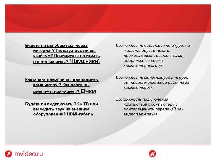 Будете ли вы общаться через интернет? Пользуетесь ли вы скайпом? Планируете ли играть в сетевые игры? (Наушники) Возможность общаться по Skype, не мешать другим людям проживающим вместе с вами, общаться во время компьютерных игр. Как много времени вы проводите у компьютера? Как долго вы Возможность минимизировать вред от продолжительной работы за компьютером. играете в видеоигры? Очки Будете ли подключать ПК к ТВ или выводить звук на внешнее оборудование? HDMI-кабель Возможность подключения компьютера к компьютеру с одновременной передачей как видео так и звука.
