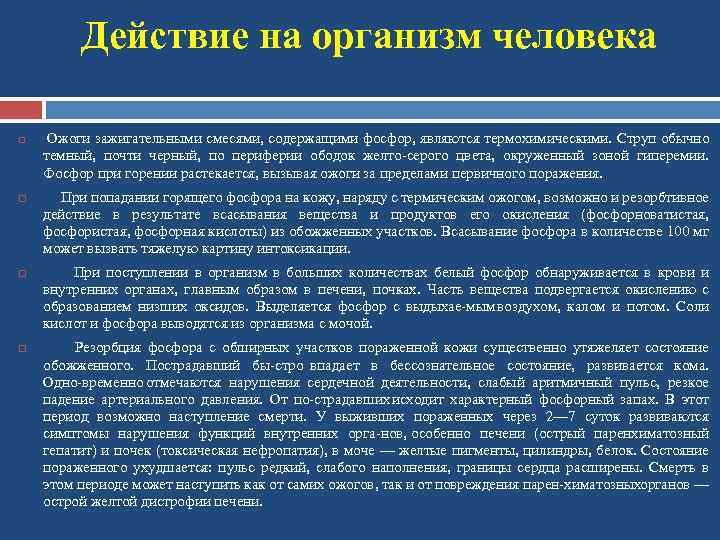 Действие на организм человека Ожоги зажигательными смесями, содержащими фосфор, являются термохимическими. Струп обычно темный, почти черный, по периферии ободок желто серого цвета, окруженный зоной гиперемии. Фосфор при горении растекается, вызывая ожоги за пределами первичного поражения. При попадании горящего фосфора на кожу, наряду с термическим ожогом, возможно и резорбтивное действие в результате всасывания вещества и продуктов его окисления (фосфорноватистая, фосфорная кислоты) из обожженных участков. Всасывание фосфора в количестве 100 мг может вызвать тяжелую картину интоксикации. При поступлении в организм в больших количествах белый фосфор обнаруживается в крови и внутренних органах, главным образом в печени, почках. Часть вещества подвергается окислению с образованием низших оксидов. Выделяется фосфор с выдыхае мым воздухом, калом и потом. Соли кислот и фосфора выводятся из организма с мочой. Резорбция фосфора с обширных участков пораженной кожи существенно утяжеляет состояние обожженного. Пострадавший бы стро впадает в бессознательное состояние, развивается кома. Одно временно отмечаются нарушения сердечной деятельности, слабый аритмичный пульс, резкое падение артериального давления. От по страдавших исходит характерный фосфорный запах. В этот период возможно наступление смерти. У выживших пораженных через 2— 7 суток развиваются симптомы нарушения функций внутренних орга нов, особенно печени (острый паренхиматозный гепатит) и почек (токсическая нефропатия), в моче — желтые пигменты, цилиндры, белок. Состояние пораженного ухудшается: пульс редкий, слабого наполнения, границы сердца расширены. Смерть в этом периоде может наступить как от самих ожогов, так и от повреждения парен химатозныхорганов — острой желтой дистрофии печени.