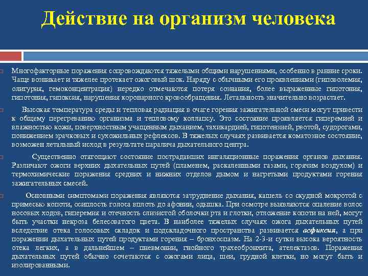 Действие на организм человека Многофакторные поражения сопровождаются тяжелыми общими нарушениями, особенно в ранние сроки. Чаще возникает и тяжелее протекает ожоговый шок. Наряду с обычными его проявлениями (гиповолемия, олигурия, гемоконцентрация) нередко отмечаются потеря сознания, более выраженные гипотония, гипоксия, нарушения коронарного кровообращения. Летальность значительно возрастает. Высокая температура среды и тепловая радиация в очаге горения зажигательной смеси могут привести к общему перегреванию организма и тепловому коллапсу. Это состояние проявляется гиперемией и влажностью кожи, поверхностным учащенным дыханием, тахикардией, гипотензией, рвотой, судорогами, понижением зрачковых и сухожильных рефлексов. В тяжелых случаях развивается коматозное состояние, возможен летальный исход в результате паралича дыхательного центра. Существенно отягощают состояние пострадавших ингаляционные поражения органов дыхания. Различают ожоги верхних дыхательных путей (пламенем, раскаленными газами, горячим воздухом) и термохимические поражения средних и нижних отделов дымом и нагретыми продуктами горения зажигательных смесей. Основными симптомами поражения являются затруднение дыхания, кашель со скудной мокротой с примесью копоти, осиплость голоса вплоть до афонии, одышка. При осмотре выявляются опаление волос носовых ходов, гиперемия и отечность слизистой оболочки рта и глотки, отложение копоти на ней, могут быть участки некроза белесоватого цвета. В наиболее тяжелых случаях ожога дыхательных путей вследствие отека голосовых складок и подскладочного пространства развивается асфиксия, а при поражении дыхательных путей продуктами горения – бронхоспазм. На 2 3 и сутки высока вероятность отека легких, а в дальнейшем – пневмонии, гнойного трахеобронхита, ателектазов. Поражения дыхательных путей обычно сочетаются с ожогами лица, шеи, грудной клетки, но могут быть и изолированными.