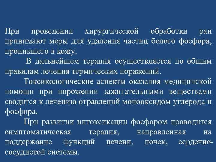 При проведении хирургической обработки ран принимают меры для удаления частиц белого фосфора, проникшего в кожу. В дальнейшем терапия осуществляется по общим правилам лечения термических поражений. Токсикологические аспекты оказания медицинской помощи при порожении зажигательными веществами сводится к лечению отравлений монооксидом углерода и фосфора. При развитии интоксикации фосфором проводится симптоматическая терапия, направленная на поддержание функций печени, почек, сердечно сосудистой системы.