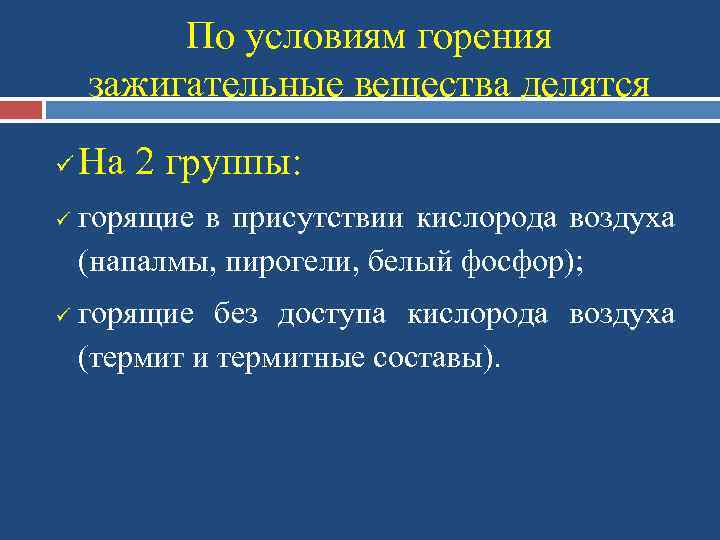 По условиям горения зажигательные вещества делятся ü ü ü На 2 группы: горящие в присутствии кислорода воздуха (напалмы, пирогели, белый фосфор); горящие без доступа кислорода воздуха (термит и термитные составы).
