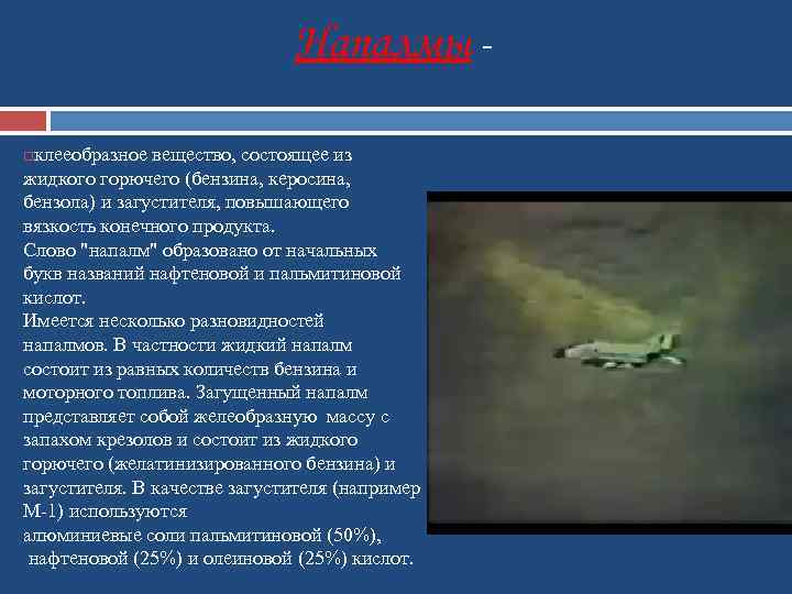 Напалмы клееобразное вещество, состоящее из жидкого горючего (бензина, керосина, бензола) и загустителя, повышающего вязкость конечного продукта. Слово "напалм" образовано от начальных букв названий нафтеновой и пальмитиновой кислот. Имеется несколько разновидностей напалмов. В частности жидкий напалм состоит из равных количеств бензина и моторного топлива. Загущенный напалм представляет собой желеобразную массу с запахом крезолов и состоит из жидкого горючего (желатинизированного бензина) и загустителя. В качестве загустителя (например М 1) используются алюминиевые соли пальмитиновой (50%), нафтеновой (25%) и олеиновой (25%) кислот.