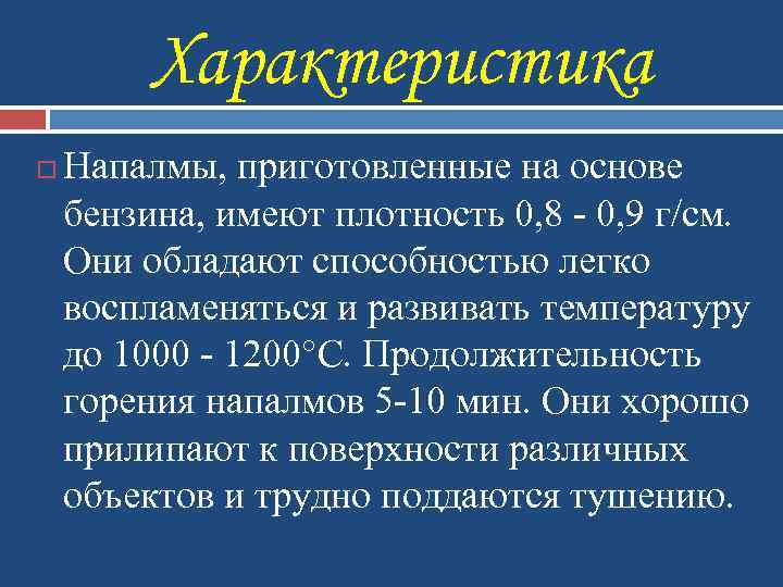Характеристика Напалмы, приготовленные на основе бензина, имеют плотность 0, 8 0, 9 г/см. Они обладают способностью легко воспламеняться и развивать температуру до 1000 1200°С. Продолжительность горения напалмов 5 10 мин. Они хорошо прилипают к поверхности различных объектов и трудно поддаются тушению.