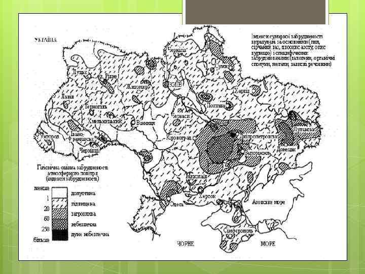 Області з найбільшим вмістом викидів забруднювальних речовин: Міста з найбільшим антропогенним навантаженням: Хмельницька Ладижин Житомирська Дніпропетровськ Вінницька Дніпродзержинськ Полтавська Зеленодольськ Миколаївська Кривий Тернопільська Луганська Ріг Донецьк Маріуполь Макіївка Запоріжжя Алчевськ Луганськ