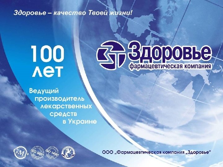 Здоровье – качество Твоей жизни! Фармацевтическая компания “Здоровье” – это высокое качество закупаемых сырьевых материалов, эффективные технологии, навыки и опыт сотрудников, а главное – уникальные по своим характеристикам, безопасные и удобные в применении лекарственные препараты. Приоритеты Фармацевтической компании "Здоровье" – высокое качество и безопасность продукции, а так же охрана окружающей среды. Первым этапом решения этих задач на предприятии являлось создание и внедрение Системы управления предприятием на базе требований международных стандартов ISO 9001: 2000, ISO 14001: 2004.