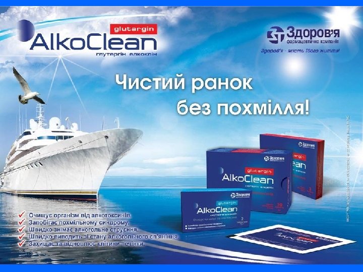 Здоровье – качество Твоей жизни! Препарат Глутаргин является брендом компании «Здоровье» . Вышел на рынок в 2001 г. в двух лекарственных формах: таблетки и 4% раствор. В 2003 г. создана новая лекарственная форма Глутаргин 40% раствор (концентрат) Глутаргин позиционируется как оригинальный гепатопротектор – детоксикант, и определяет новое направление в гепато-, токсико- и инфектологии. В 2003 г. и 2005 г. по Глутаргину были проведены 2 Всеукраинские научнопрактические конференции, докладчиками которой были ведущие ученые, специалисты Министерства Здравоохранения Украины: Харченко Н. В. , Бабак О. Я. , Степанов Ю. М. , Дзяк Г. В. , Губергриц Н. Б. , Фролов В. М. и другие. В 2005 г. – Глутаргин получил награду «Панацея-2005» в номинации «Бизнес-проект года» На сегодняшний день Глутаргин эффективно используется в следующих областях медицины: гепатология, гастроэнтерология, инфектология, иммунология, гинекология, онкология, офтальмология и клинике внутренних болезней. Детоксикационное действие Глутаргина, подтвержденное многочисленнымиклиническими исследованиями, позволило создать на его основе эффективный детоксикант, используемый для профилактики и лечения алкогольных интоксикаций – ГЛУТАРГИН АЛКОКЛИН