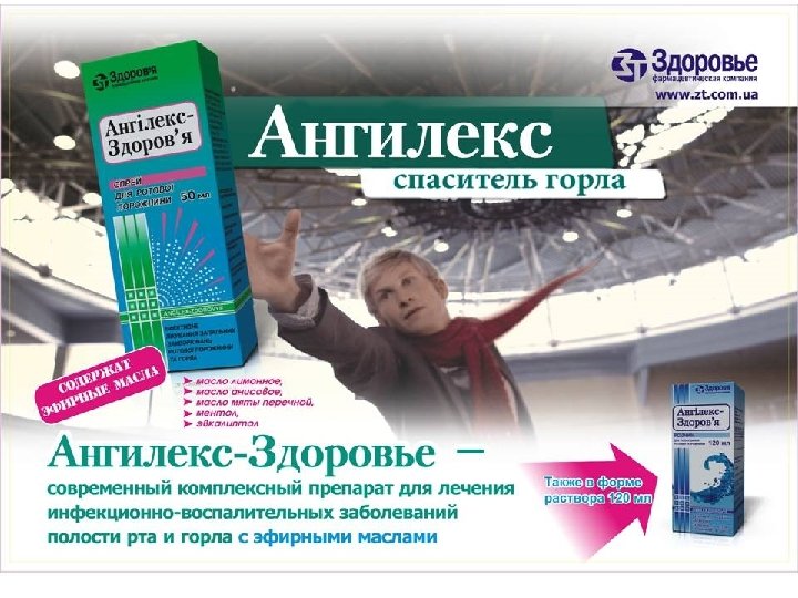 Здоровье – качество Твоей жизни! Ангилекс-Здоровье, р-р д/полоскания рот. полости по 120 мл Состав: Действующие вещества: гексетидин, холина салицилат, хлорбутанол гемигидрат; 100 мл раствора содержат гексетидина 0, 1 г, холина салицилата 0, 5 г, хлорбутанола гемигидрата 0, 25 г Фармакотерапевтическая группа. Препараты, применяемые при заболеваниях горла. Различные антисептики. RО 2 A A 20 Ангилекс-Здоровье, спрей 50 мл Состав: Действующие вещества: гексетидин, холина салицилат, хлорбутанола гемигидрат; 100 мл препарата содержат гексетидина в пересчете на 100% вещество 0, 1 г, холина салицилата в пересчете на 100% вещество 0, 5 г, хлорбутанола гемигидрата в пересчете на 100% вещество 0, 25 г; Фармакотерапевтическая группа. Препараты, применяемые при заболеваниях горла. Различные антисептики. Код АТС RО 2 A A 20. АНГИЛЕКС-Здоровье – это забота о пациенте благодаря комплексу эфирных масел, обеспечивающих смягчающее действие на воспаленную слизистую полости рта и горла и проявляющих дезодорирующий эффект. Обладает пролонгированным действием, активные вещества фиксируются на слизистой оболочке полости рта, откуда постепенно высвобождаются. Разрешен к применению у детей с 2, 5 лет. Ангилекс-Здоровье – современный комплексный препарат для лечения инфекционно-воспалительных заболеваний полости рта и горла с эфирными маслами