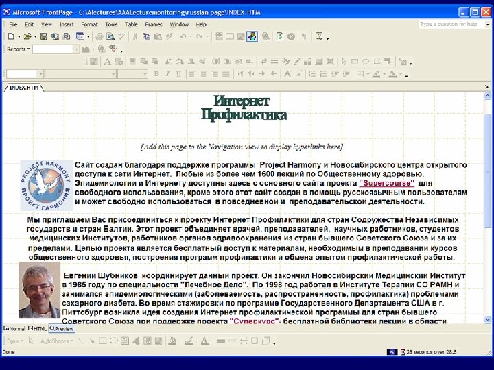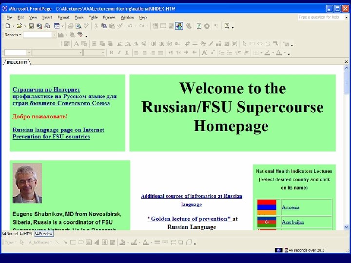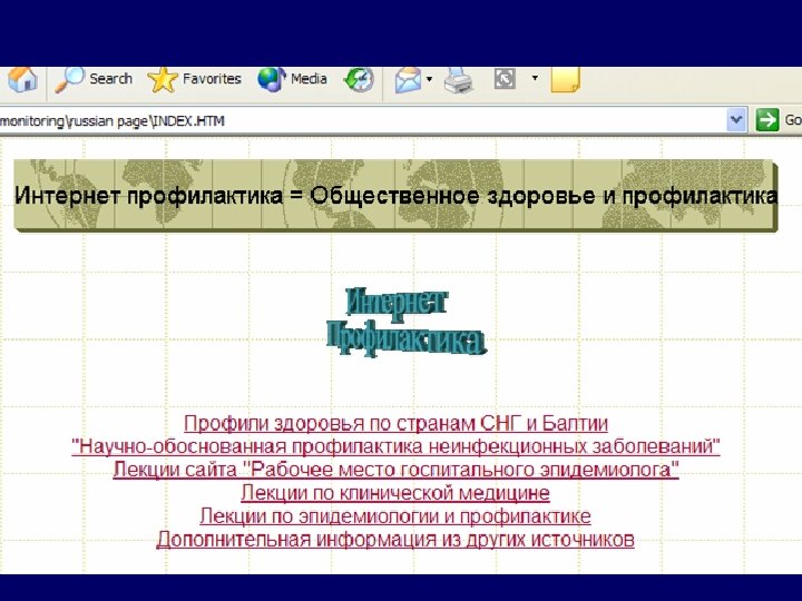 Российская/СБCС И-Профилактика состоит: • Сеть российских ученых, вовлеченных интернет и профилактику в РоссииСБСС • Русскоязычная (и на языках СБСС) библиотека лекций в Интернете • Научная кооперация между российскими, американскими и учеными из СБСС с учеными всего мира в области эпидемиологии, общественного здоровья и Интернета.