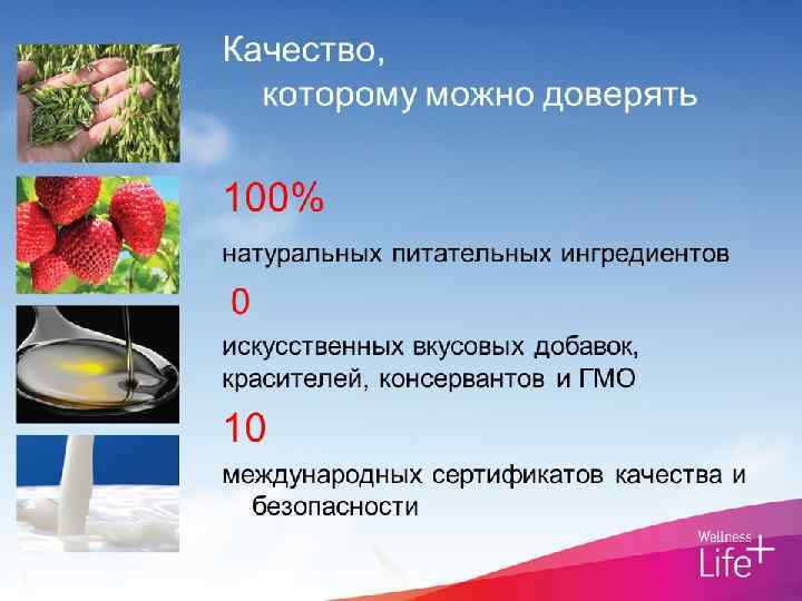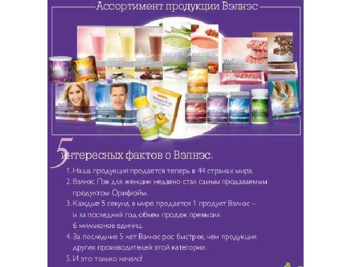 Основные ингредиенты – Вэлнэс Пэк Мультивитамины и минералы: • Не вырабатываются организмом; должны поступать с пищей • Необходимы для здоровья • Мы не можем существовать без них Повышенное содержание фолиевой кислоты, железа и кальция специально для женщин Повышенное содержание магния, цинка и селена специально для мужчин