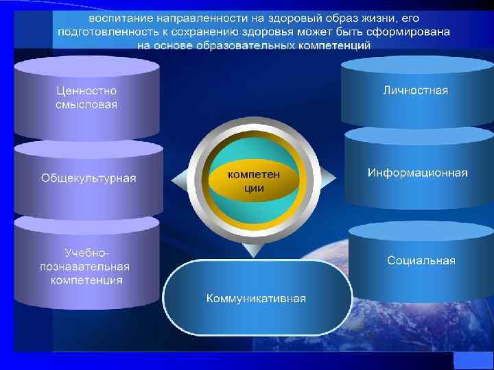 l l l Ребенок не кувшин, который надо заполнить, а лампада, которую надо зажечь Под мотивацией здоровья и здорового образа жизни понимается осознание человеком необходимости сохранения здоровья как основы для проявления в различных сферах жизнедеятельности, как основы его гармонического развития и выполнение в связи с этим тех или иных мероприятий по сохранению и поддержанию здоровья, соблюдения для этих же целей принципов здорового образа жизни. При отсутствии мотивации у человека любые программы и мероприятия по сохранению здоровья будут слабо эффективны или вообще нерезультативны. Компетентность – это владение человеком соответствующей компетенцией, содержащей его личностное отношение к предмету деятельности. Компетентностный подход – это подход, акцентирующий внимание на результаты образования, причем в качестве результата рассматривается не сумма усвоенной информации, а способность человека действовать в различных проблемных ситуациях. Личностная компетенция направлена на освоение способов физического, духовного и интеллектуального самосовершенствования, эмоциональной саморегуляции и самоподдержки своего личного здоровья. Сюда же входит комплекс качеств, связанных с основами безопасной жизнедеятельности личности