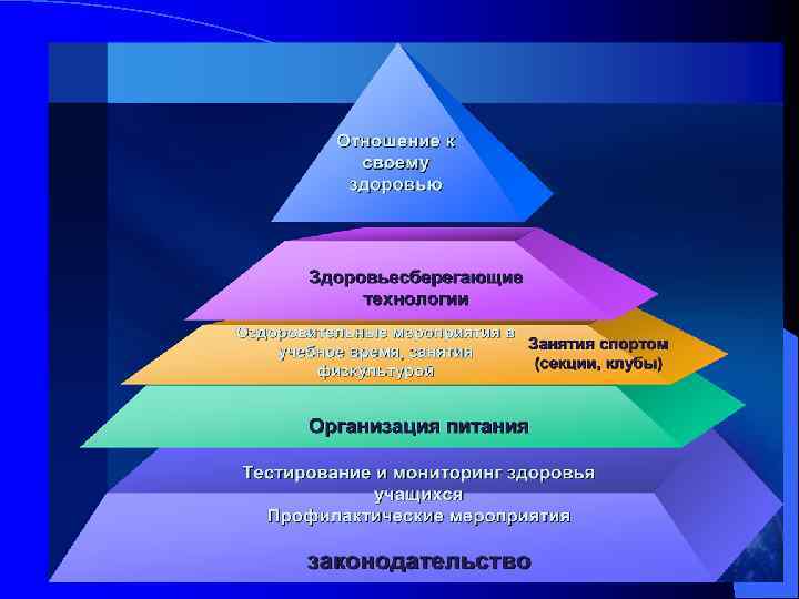 Здоровьесберегающее образование – новое направление инновационной деятельности в системе образования l l l l Создание в ОУ необходимых условий (кадровых, нормативно-правовых, учебно-методических, материальных, организационных, финансовых) для сохранения и укрепления здоровья обучающихся и работников образования; Соблюдение санитарно-гигиенических норм и правил, нормирование учебной нагрузки и профилактика утомляемости; Модернизация форм и методов организации образовательного процесса; Организация регулярного медико-психолого-педагогического мониторинга состояния здоровья обучающихся; Проведение коррекции нарушений соматического, психического и нравственного здоровья совместно с медиками, психологами, используя оздоровительные технологии; Создание положительного психологического климата, основанного на доверии, справедливости, уважении всех участников образовательного процесса; Сохранение паритета образованности и здоровья обучающихся: в здоровьесберегающем образовании здоровье рассматривается как результат всего образовательного процесса.