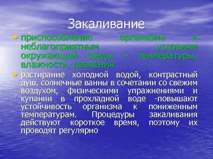 Закаливание • приспособление организма к неблагоприятным условиям окружающей среды – температуры, влажности, давления. • растирание холодной водой, контрастный душ, солнечные ванны в сочетании со свежим воздухом, физическими упражнениями и купании в прохладной воде -повышают устойчивость организма к пониженным температурам. Процедуры закаливания действуют короткое время, поэтому их проводят регулярно