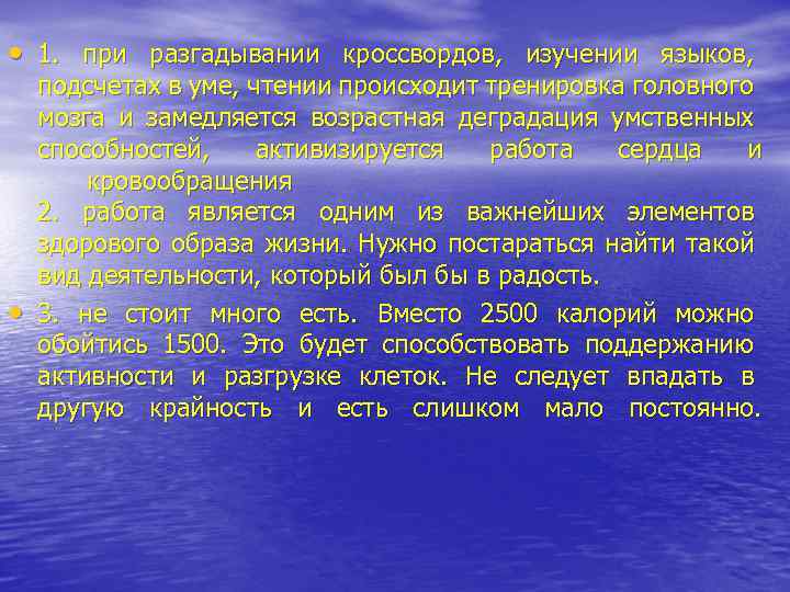 • 1. при разгадывании кроссвордов, изучении языков, • подсчетах в уме, чтении происходит тренировка головного мозга и замедляется возрастная деградация умственных способностей, активизируется работа сердца и кровообращения 2. работа является одним из важнейших элементов здорового образа жизни. Нужно постараться найти такой вид деятельности, который был бы в радость. 3. не стоит много есть. Вместо 2500 калорий можно обойтись 1500. Это будет способствовать поддержанию активности и разгрузке клеток. Не следует впадать в другую крайность и есть слишком мало постоянно.