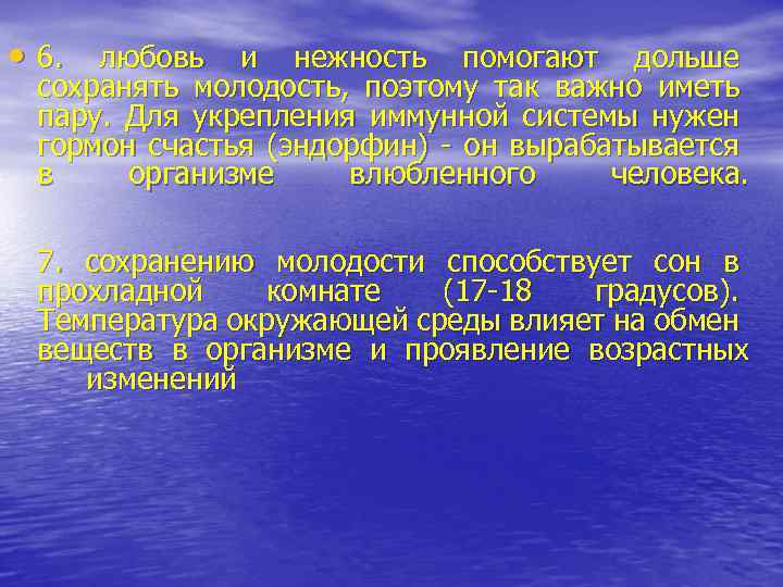 • 6. любовь и нежность помогают дольше сохранять молодость, поэтому так важно иметь пару. Для укрепления иммунной системы нужен гормон счастья (эндорфин) - он вырабатывается в организме влюбленного человека. 7. сохранению молодости способствует сон в прохладной комнате (17 -18 градусов). Температура окружающей среды влияет на обмен веществ в организме и проявление возрастных изменений