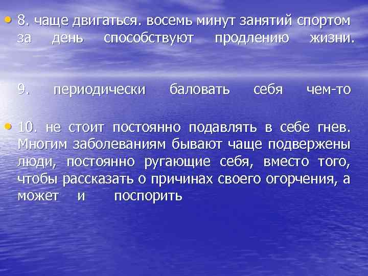 • 8. чаще двигаться. восемь минут занятий спортом за день способствуют 9. периодически продлению баловать себя жизни. чем-то • 10. не стоит постоянно подавлять в себе гнев. Многим заболеваниям бывают чаще подвержены люди, постоянно ругающие себя, вместо того, чтобы рассказать о причинах своего огорчения, а может и поспорить