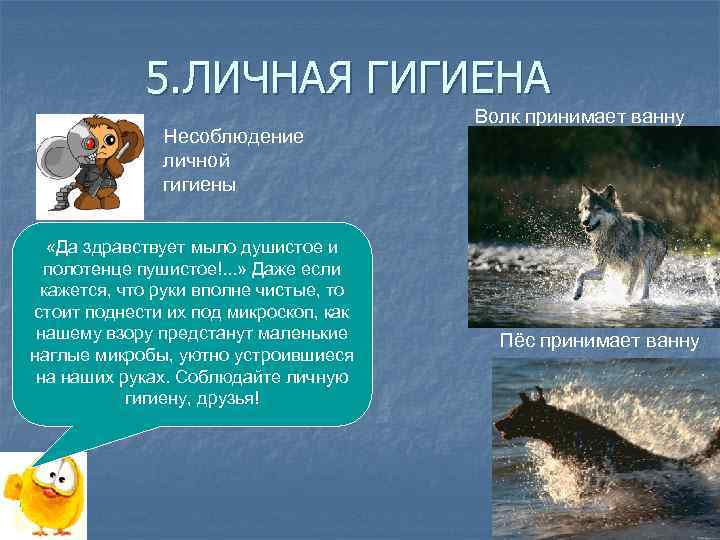 5. ЛИЧНАЯ ГИГИЕНА Несоблюдение личной гигиены «Да здравствует мыло душистое и полотенце пушистое!. . . » Даже если кажется, что руки вполне чистые, то стоит поднести их под микроскоп, как нашему взору предстанут маленькие наглые микробы, уютно устроившиеся на наших руках. Соблюдайте личную гигиену, друзья! Волк принимает ванну Пёс принимает ванну