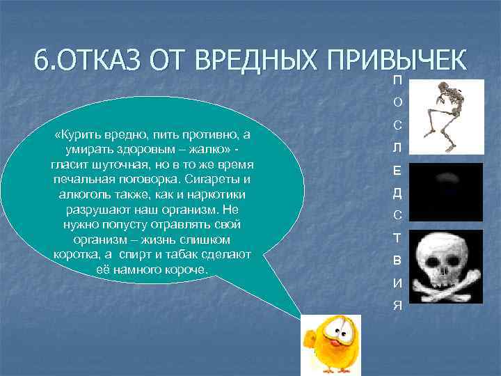 6. ОТКАЗ ОТ ВРЕДНЫХ ПРИВЫЧЕК П О «Курить вредно, пить противно, а умирать здоровым – жалко» гласит шуточная, но в то же время печальная поговорка. Сигареты и алкоголь также, как и наркотики разрушают наш организм. Не нужно попусту отравлять свой организм – жизнь слишком коротка, а спирт и табак сделают её намного короче. С Л Е Д С Т В И Я