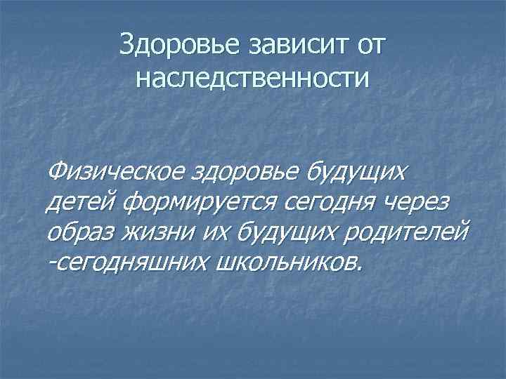 Здоровье зависит от наследственности Физическое здоровье будущих детей формируется сегодня через образ жизни их будущих родителей -сегодняшних школьников.