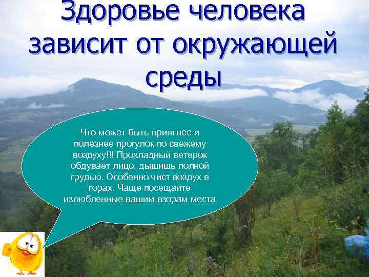 Здоровье человека зависит от окружающей среды Что может быть приятнее и полезнее прогулок по свежему воздуху!!! Прохладный ветерок обдувает лицо, дышишь полной грудью. Особенно чист воздух в горах. Чаще посещайте излюбленные вашим взорам места