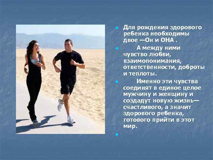 n n Для рождения здорового ребенка необходимы двое —Он и ОНА. А между ними чувство любви, взаимопонимания, ответственности, доброты и теплоты. Именно эти чувства соединят в единое целое мужчину и женщину и создадут новую жизнь— счастливого, а значит здорового ребенка, готового прийти в этот мир.
