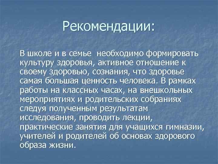 Рекомендации: В школе и в семье необходимо формировать культуру здоровья, активное отношение к своему здоровью, сознания, что здоровье самая большая ценность человека. В рамках работы на классных часах, на внешкольных мероприятиях и родительских собраниях следуя полученным результатам исследования, проводить лекции, практические занятия для учащихся гимназии, учителей и родителей об основах здорового образа жизни.