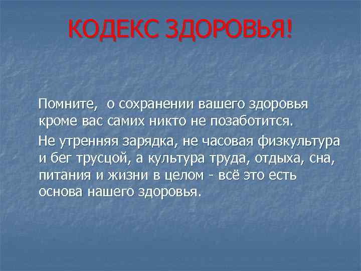 КОДЕКС ЗДОРОВЬЯ! Помните, о сохранении вашего здоровья кроме вас самих никто не позаботится. Не утренняя зарядка, не часовая физкультура и бег трусцой, а культура труда, отдыха, сна, питания и жизни в целом - всё это есть основа нашего здоровья.