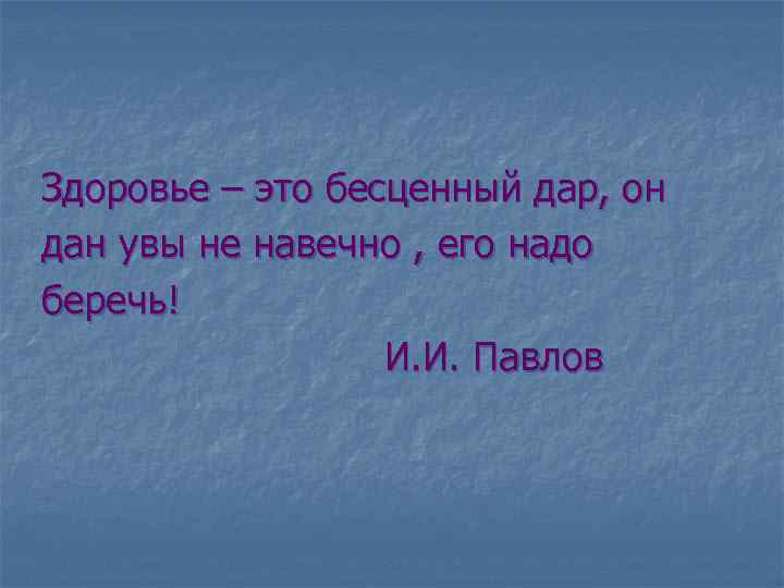 Здоровье – это бесценный дар, он дан увы не навечно , его надо беречь! И. И. Павлов