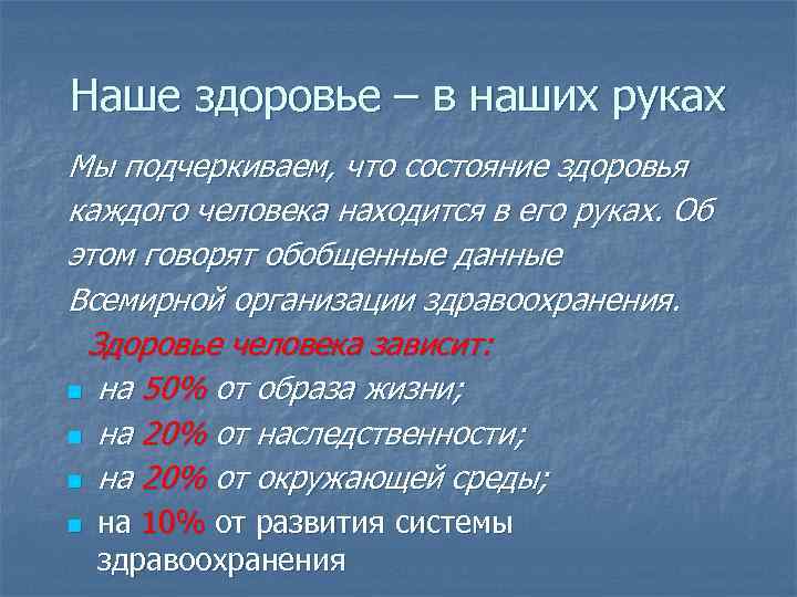 Наше здоровье – в наших руках Мы подчеркиваем, что состояние здоровья каждого человека находится в его руках. Об этом говорят обобщенные данные Всемирной организации здравоохранения. Здоровье человека зависит: n на 50% от образа жизни; n на 20% от наследственности; n на 20% от окружающей среды; n на 10% от развития системы здравоохранения