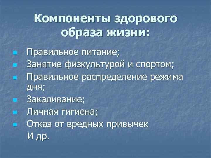 Компоненты здорового образа жизни: Правильное питание; n Занятие физкультурой и спортом; n Правильное распределение режима дня; n Закаливание; n Личная гигиена; n Отказ от вредных привычек И др. n