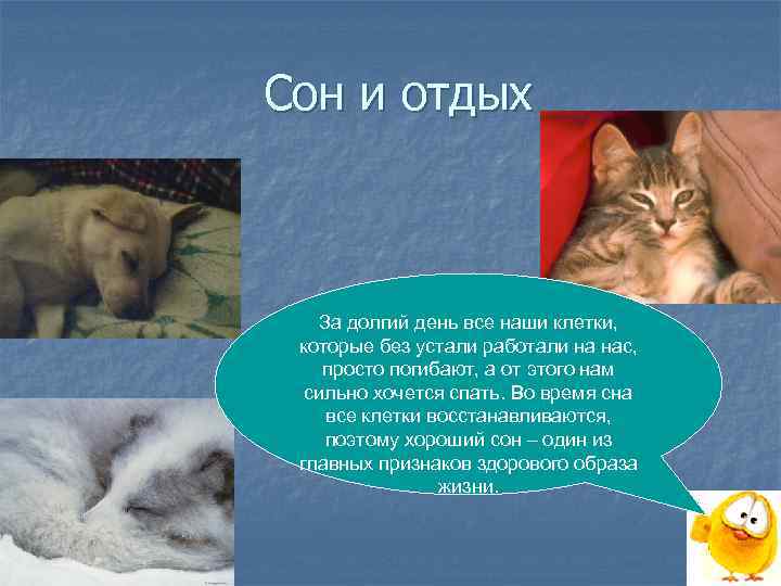 Сон и отдых За долгий день все наши клетки, которые без устали работали на нас, просто погибают, а от этого нам сильно хочется спать. Во время сна все клетки восстанавливаются, поэтому хороший сон – один из главных признаков здорового образа жизни.