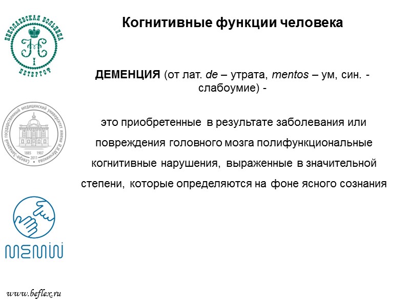 Когнитивные функции человека www.beflex.ru ДЕМЕНЦИЯ (от лат. de – утрата, mentos – ум, син. - слабоумие) - это приобретенные в результате заболевания или повреждения головного мозга полифункциональные когнитивные нарушения, выраженные в значительной степени, которые определяются на фоне ясного сознания