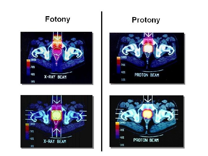 Hadronová terapie (III) • pro doběh 25 cm: Ep = 200 Me. V, E 12 C = 4500 Me. V • největší výhoda lze použít v blízkosti citlivých orgánů • p a g interagují s DNA spíše nepřímo pomocí radikálů x pro 12 C už je důležitá i přímá interakce s DNA (větší LET) – C zanechá 23 x více energie než p se stejným doběhem • přímá interakce s DNA je významná pro LET > 20 ke. V/mm – C má tuto ionizaci na posledních 5 cm dráhy (He na posledním 1 mm) • čím větší ionizační ztráty, tím horší reparace DNA • lze sledovat ozáření pomocí PET (dopadající kladné ionty dávají vzniknout + radioaktivním jádrům)