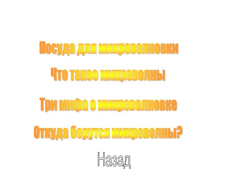 Микроволны- это электромагнитные волны, которые существуют и в природе в виде световых волн с неионизирующей частотой, другими словами это волны, не вызывающие химических преобразований. Микроволны внутри печи проникают в пищу со всех сторон, нагревая молекулы воды, жира и сахара. Тепло проникает быстро и только внутри продуктов. Микроволны, используемые приготовлении пищи, могут проходить сквозь стекло, бумагу пластик и фарфор, но не проникают через металл. Молекулы пищи и жидкости содержат отрицательные и положительные частицы, которые постоянно медленно вращаются. При приготовлении пищи в микроволнах это движение ускоряется. В результате возникает тепло, которое готовит пищу и вызывает кипение воды. Приготовление пищи в обычной духовке или на плите тоже происходит за счет молекулярных воздействий, но микроволны делают это быстрее, поскольку они проникают в пищу напрямую, сокращая таким образом, время, необходимое для приготовления. На что похожи микроволны? Микроволновые печи работают от обычного электрического тока, который питает магнетон- "сердце " печи. При наличии питания магнетон генерирует высокочастотную электромагнитную энергию - микроволны. Затем через две форсунки они направляются в полость печи. Полость печи оборудована металлическими стенками, отражающими микроволны, и вращающимся поддоном, обеспечивающим однородное распределение волн.