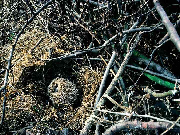 Еж собирает сухие листья, чтобы сделать тёплую норку.