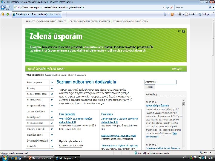Dodavatelé a výrobek § Investici musí provést firma zařazena v Seznamu odborných dodavatelů (u panelových domů s certifikací ISO 9001/9002) § Výrobky či technologie, které chcete použít, musí byt zaregistrovány v Seznamu výrobků a technologií. § Oba seznamy jsou zveřejněné na webových stránkách programu (www. zelenausporam. cz). § Registrace je bezplatná.