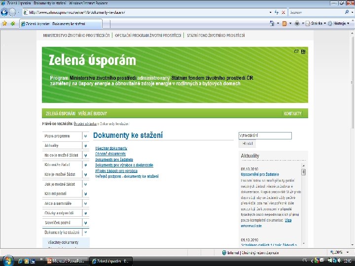 Zelená úsporám § Program Ministerstva životního prostředí administrovaný Státním fondem životního prostředí ČR, zaměřený na úspory energie a obnovitelné zdroje energie v rodinných a bytových domech § Podpora kvalitního zateplování rodinných domů a bytových domů, náhrada neekologického vytápění za nízkoemisní zdroje na biomasu a účinná tepelná čerpadla, instalace těchto zdrojů do nízkoenergetických novostaveb a také výstavba v pasivním energetickém standardu. § Investice do zateplení, koupě solárních kolektorů nebo dalších podporovaných opatření, které sníží náklady na vytápění, případně ohřev vody. Provedením opatření se dále přispěje ke zlepšení životního prostředí.