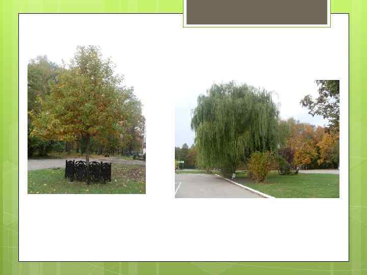 2. 1. Деревья парка В парке произрастают следующие деревья: • Береза • Ясень • Дуб • Сосна • Клен • Липа • Белая ива • Тополь • Ель • Туя