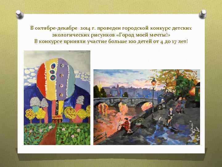 В октябре-декабре 2014 г. проведен городской конкурс детских экологических рисунков «Город моей мечты!» В конкурсе приняли участие больше 100 детей от 4 до 17 лет!