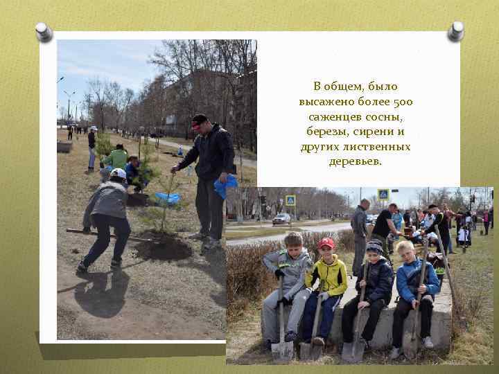 В общем, было высажено более 500 саженцев сосны, березы, сирени и других лиственных деревьев.