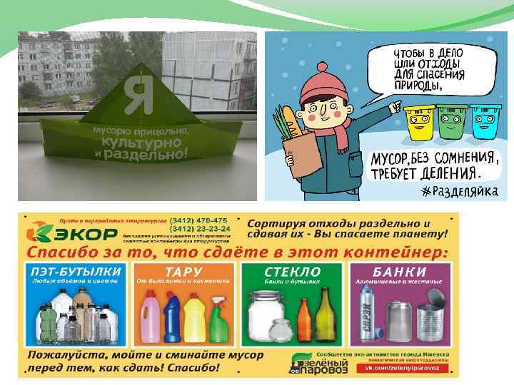 Зеленый паровоз - неформальное сообщество активистов и волонтеров города Ижевска Экопросвещение: открытые уроки в школах, лекции и мастер-классы на городских праздниках, проведение акций по сбору вторресурсов, посадка деревьев, пропаганда здорового образа жизни, продвижение идеи раздельного сбора мусора в Ижевске через СМИ и в группе ВКонтакте • Информирование: создание базы данных по пунктам приема вторсырья • Консультирование предпринимателей по зеленому маркетингу •