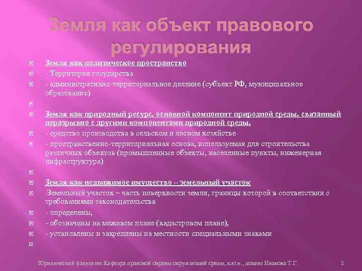 Земля как объект правового регулирования Земля как политическое пространство - Территория государства - административно-территориальное деление (субъект РФ, муниципальное образование) Земля как природный ресурс, основной компонент природной среды, связанный неразрывно с другими компонентами природной среды. - средство производства в сельском и лесном хозяйстве - пространственно-территориальная основа, используемая для строительства различных объектов (промышленные объекты, населенные пункты, инженерная инфраструктура) Земля как недвижимое имущество – земельный участок Земельный участок – часть поверхности земли, границы которой в соответствии с требованиями законодательства - определены, - обозначены на межевом плане (кадастровом плане), - установлены и закреплены на местности специальными знаками Юридический факультет Кафедра правовой охраны окружающей среды, к. ю. н. , доцент Иванова Т. Г. 2