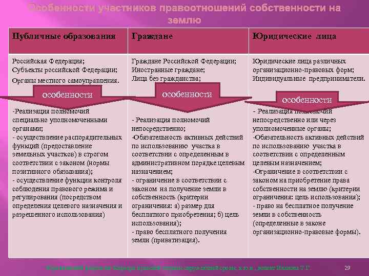 Правовой статус собственника имеет общедозволительный характер с ограничивающими условиями Совершать любые действия по своему усмотрению с учетом ограничивающих условий: Земля как основа жизни и деятельности народов, проживающих на соответствующей территории Земля как компонент природной среды и окружающей среды; Целевого назначения и видов разрешенного использования земельного участка; Определенных целей использования различных видов природных ресурсов (водных объектов, лесных насаждений) Юридический факультет Кафедра правовой охраны окружающей среды, к. ю. н. , доцент Иванова Т. Г. 28