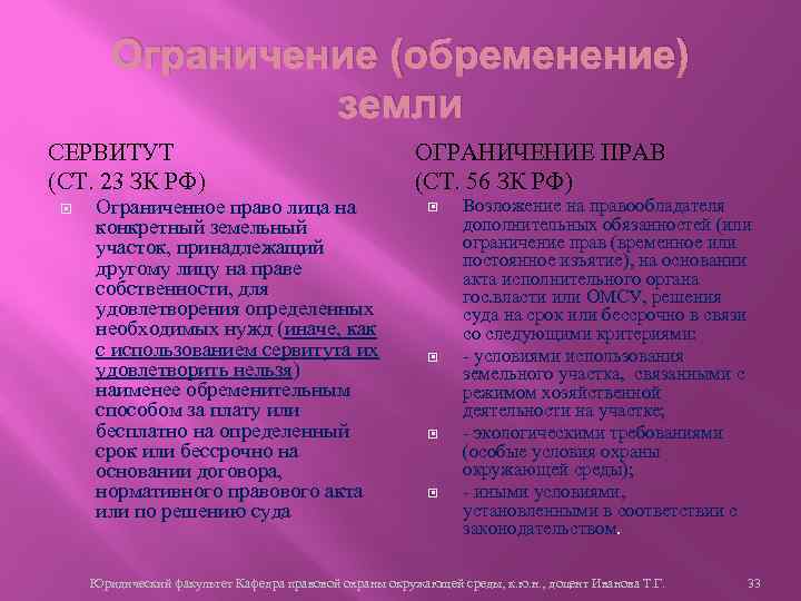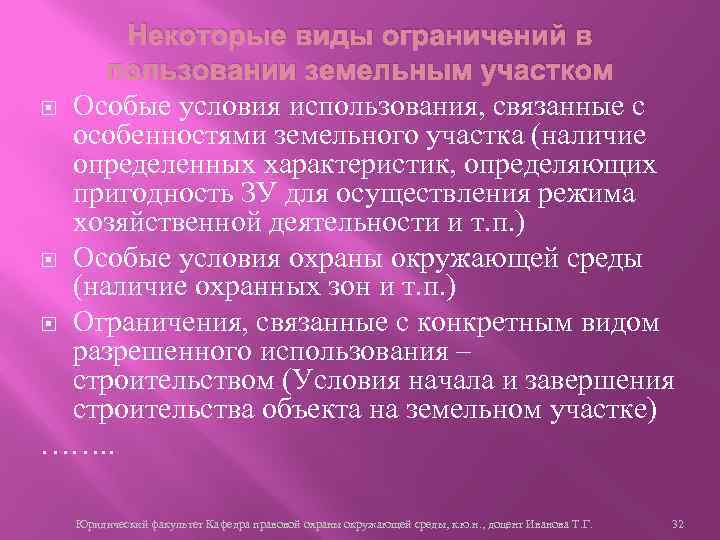 Некоторые виды ограничений в пользовании земельным участком Особые условия использования, связанные с особенностями земельного участка (наличие определенных характеристик, определяющих пригодность ЗУ для осуществления режима хозяйственной деятельности и т. п. ) Особые условия охраны окружающей среды (наличие охранных зон и т. п. ) Ограничения, связанные с конкретным видом разрешенного использования – строительством (Условия начала и завершения строительства объекта на земельном участке) ……. . Юридический факультет Кафедра правовой охраны окружающей среды, к. ю. н. , доцент Иванова Т. Г. 32