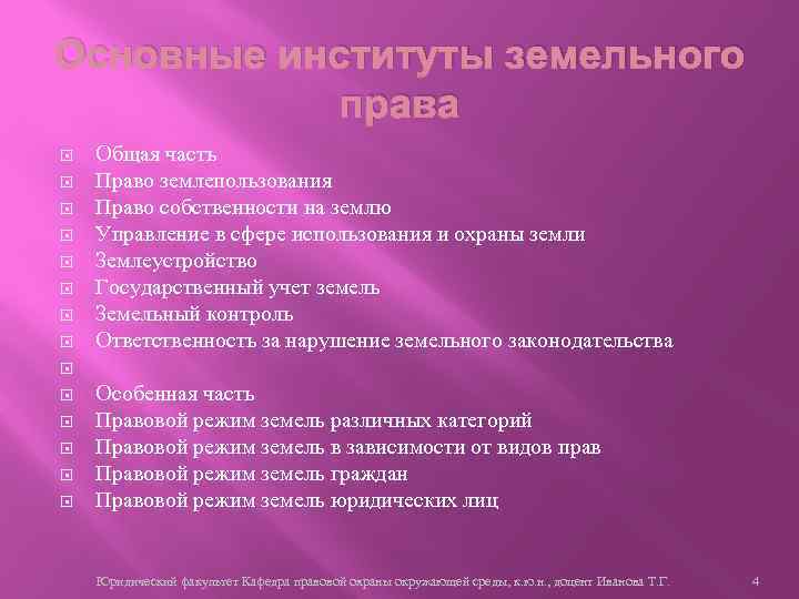 Некоторые основные принципы земельного права Межотраслевые - учет значения земли как основы жизни и деятельности человека - приоритете охраны земли как важнейшего компонента природной среды и средства производства в сельском и лесном хозяйстве перед использованием земли в качестве недвижимого имущества - приоритет охраны жизни и здоровья человека - …. . Отраслевые - многообразие форм собственности на землю - множественность прав на землю - принцип целевого использования земли - единство судьбы земельного участка и всех расположенных на нем объектов - устойчивость землепользования - платность землепользования - участие граждан и общественных организаций в решении вопросов, касающихся их прав на землю - равенство участников земельных правоотношений в защите своих прав на землю - …. . Юридический факультет Кафедра правовой охраны окружающей среды, к. ю. н. , доцент Иванова Т. Г. 3