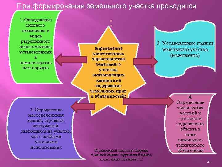 При формировании земельного участка проводится 1. Определение целевого назначения и видов разрешенного использования, установленных в административ ном порядке 3. Определение местоположения зданий, строений, сооружений, имеющихся на участке, зон с особыми условиями использования : определение качественных характеристик земельного участка, оказывающих влияние на содержание земельных прав и обязанностей: Юридический факультет Кафедра правовой охраны окружающей среды, к. ю. н. , доцент Иванова Т. Г. 2. Установление границ земельного участка (межевание) 4. Определение технических условий и стоимости подключения объекта к сетям инженернотехнического обеспечения 41