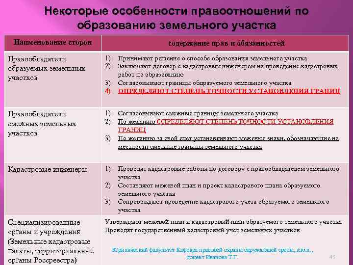 Некоторые особенности правоотношений по образованию земельного участка Наименование сторон содержание прав и обязанностей Правообладатели образуемых земельных участков 1) 2) Правообладатели смежных земельных участков 1) 2) Кадастровые инженеры 1) 3) 4) 3) 2) 3) Специализированные органы и учреждения (Земельные кадастровые палаты, территориальные органы Россреестра) Принимают решение о способе образования земельного участка Заключают договор с кадастровым инженером на проведение кадастровых работ по образованию Согласовывают границы облразуемого земельного участка ОПРЕДЕЛЯЮТ СТЕПЕНЬ ТОЧНОСТИ УСТАНОВЛЕНИЯ ГРАНИЦ Согласовывают смежные границы земельного участка По желанию ОПРЕДЕЛЯЮТ СТЕПЕНЬ ТОЧНОСТИ УСТАНОВЛЕНИЯ ГРАНИЦ По желанию за свой счет устанавливают межевые знаки, обозначающие на местности смежные границы земельного участка Проводят кадастровые работы по договору с правообладателем земельного участка Составляют межевой план и проект кадастрового плана образуемого земельного участка Сопровождают проведение кадастрового учета образуемого земельного участка Утверждают межевой план и кадастровый план образуемого земельного участка Проводят государственный кадастровый учет земельных участков Юридический факультет Кафедра правовой охраны окружающей среды, к. ю. н. , доцент Иванова Т. Г. 45